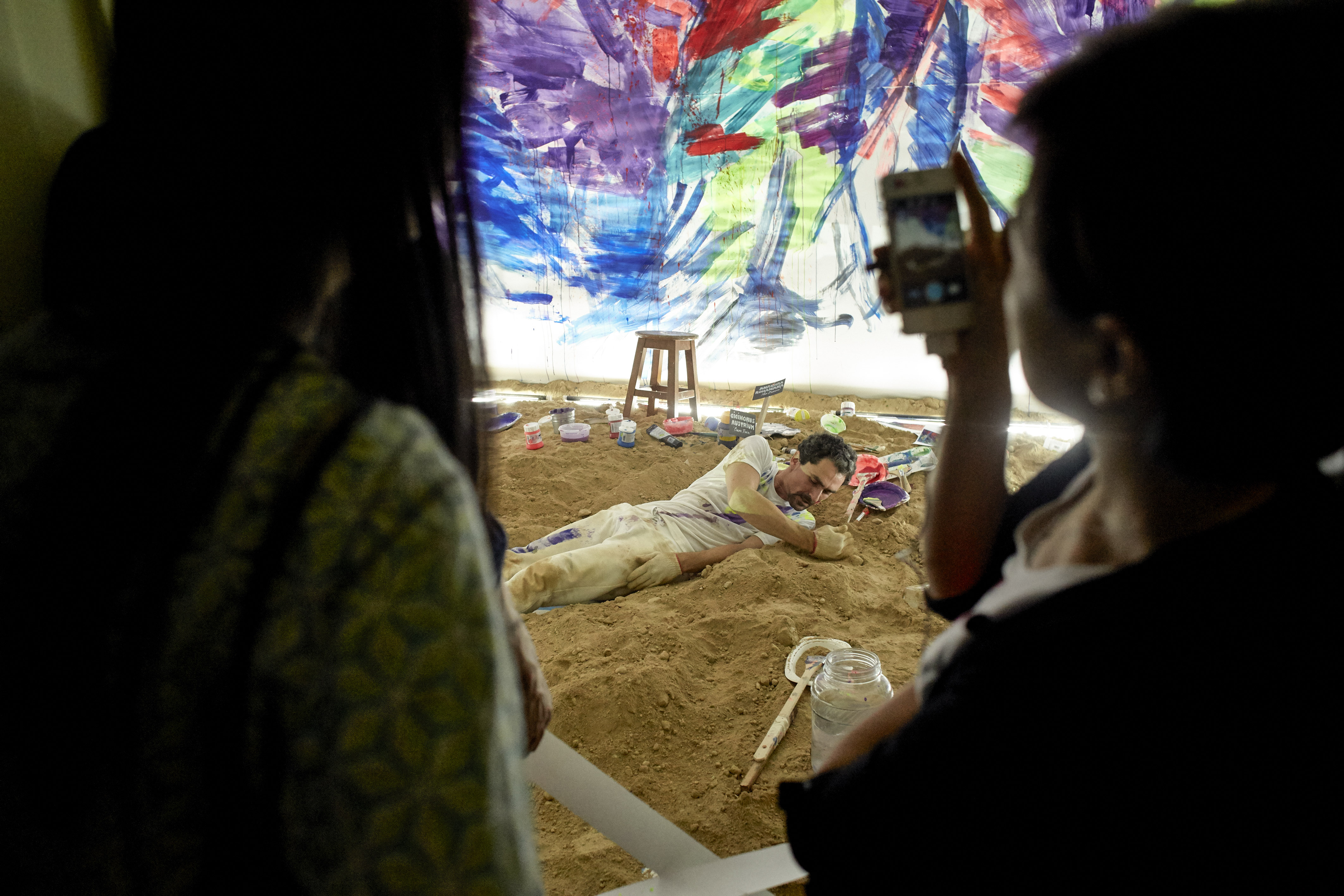 Three people in a room. Painting, composing, filming. Neck-deep.