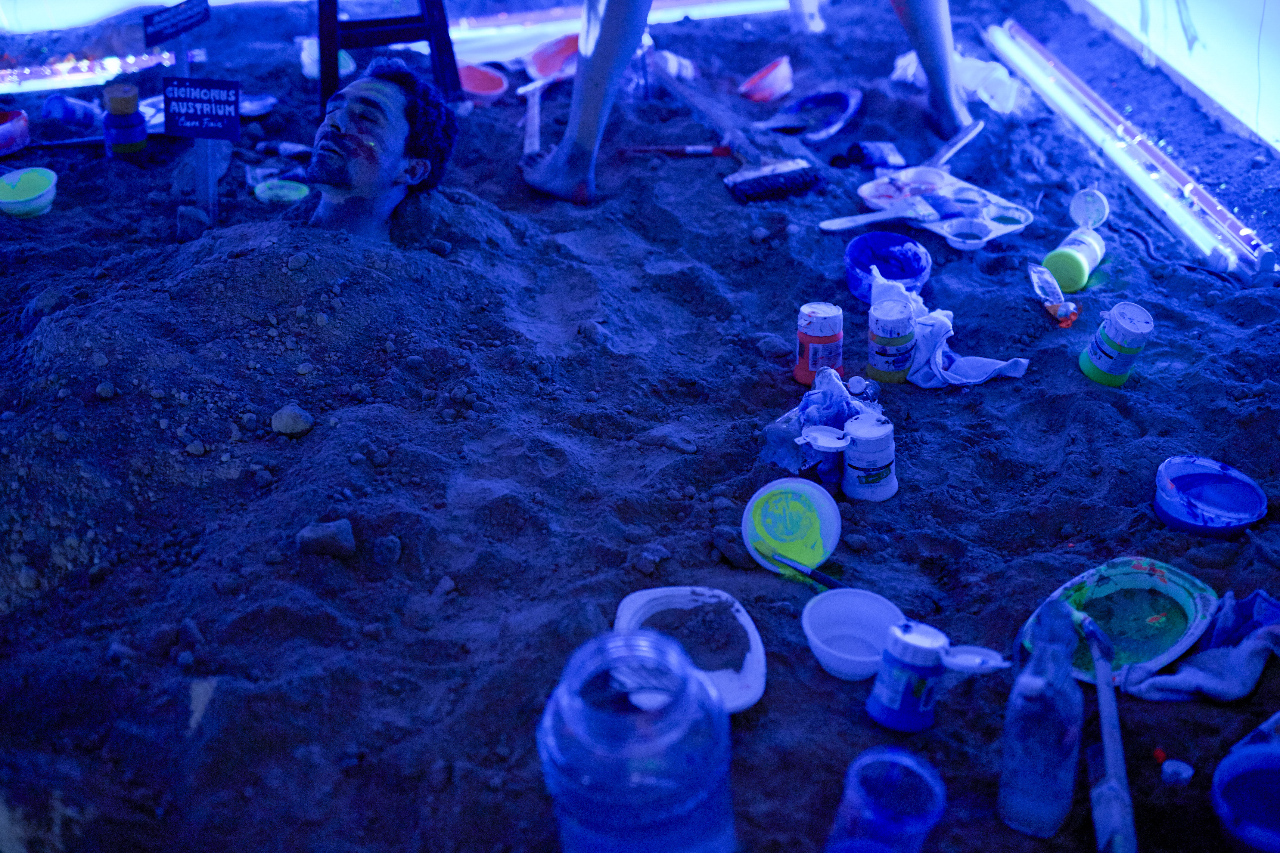 FDB: Really? Well after all you’re the reporter here, we’re just artists (laughs hard). No, seriously speakin’, as often in the art game, as we like to call it, there is not so much to figure out, to understand. It is what it was: A room filled with 1,5 tons of soil, 3 performers and a subwoofer (laughs).