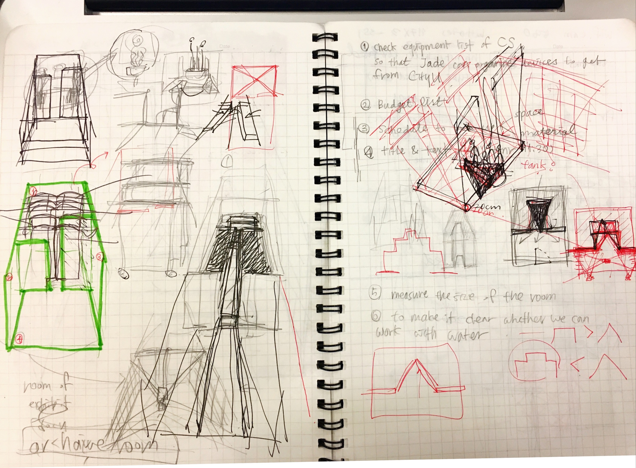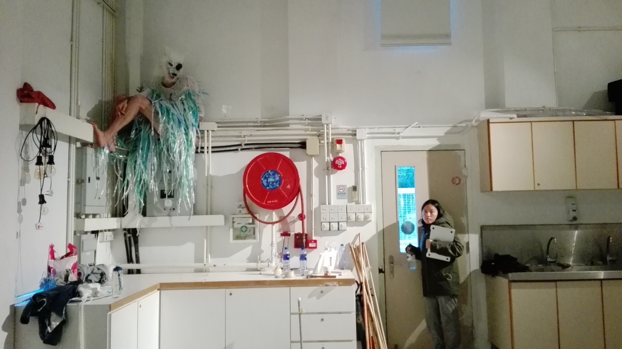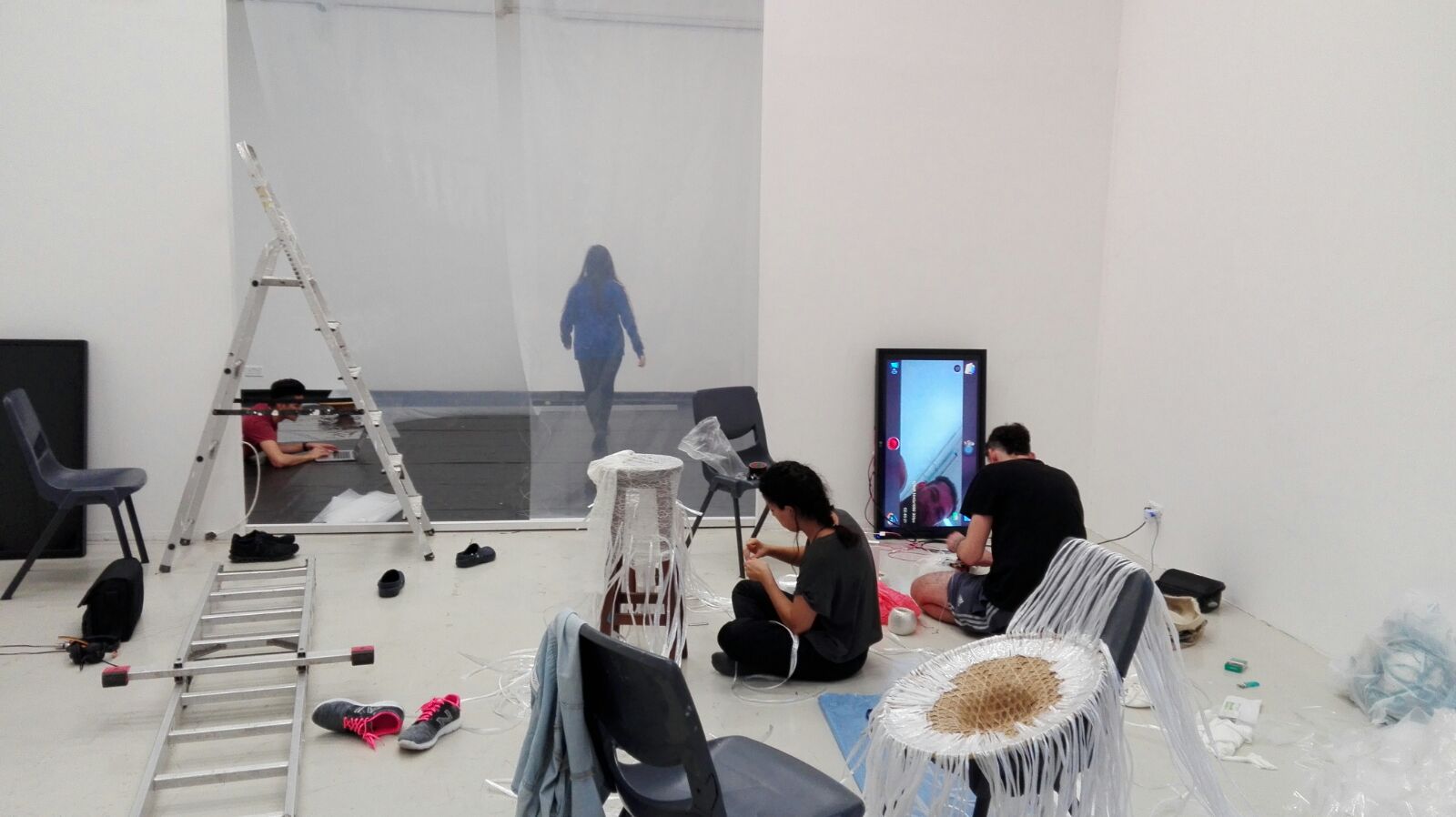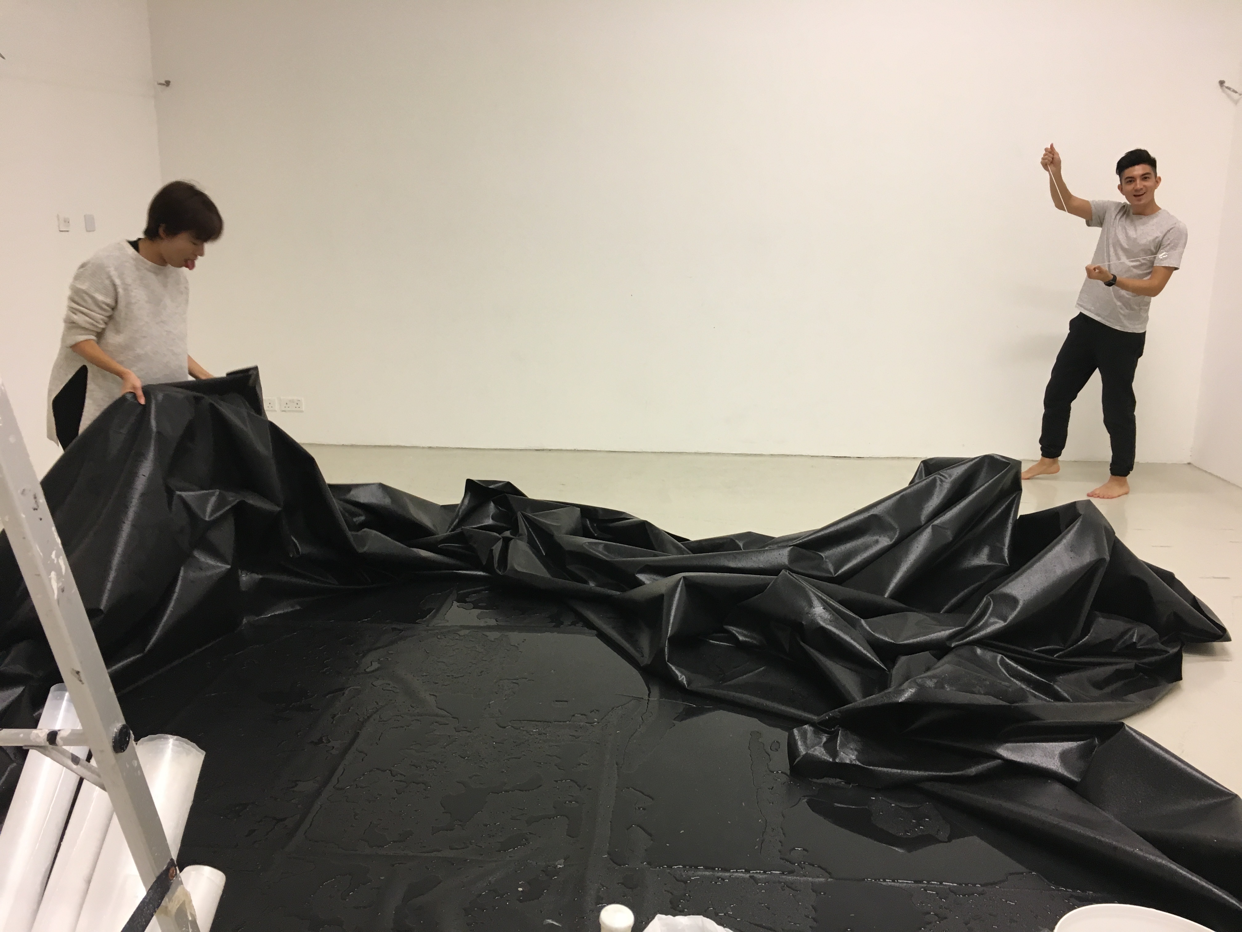 The partition of the two walls in the room led us to separate the room into two parts. We decided to design the posterior room a space for ‘reflection’. To utilise all four walls and the floor as either a mirror or reflecting plate, we built 5 layers of pvc curtain in between the two partition wall. Also we spread black waterproof pvc on the floor to fill the water on it so that the water could reflect the light and projection.