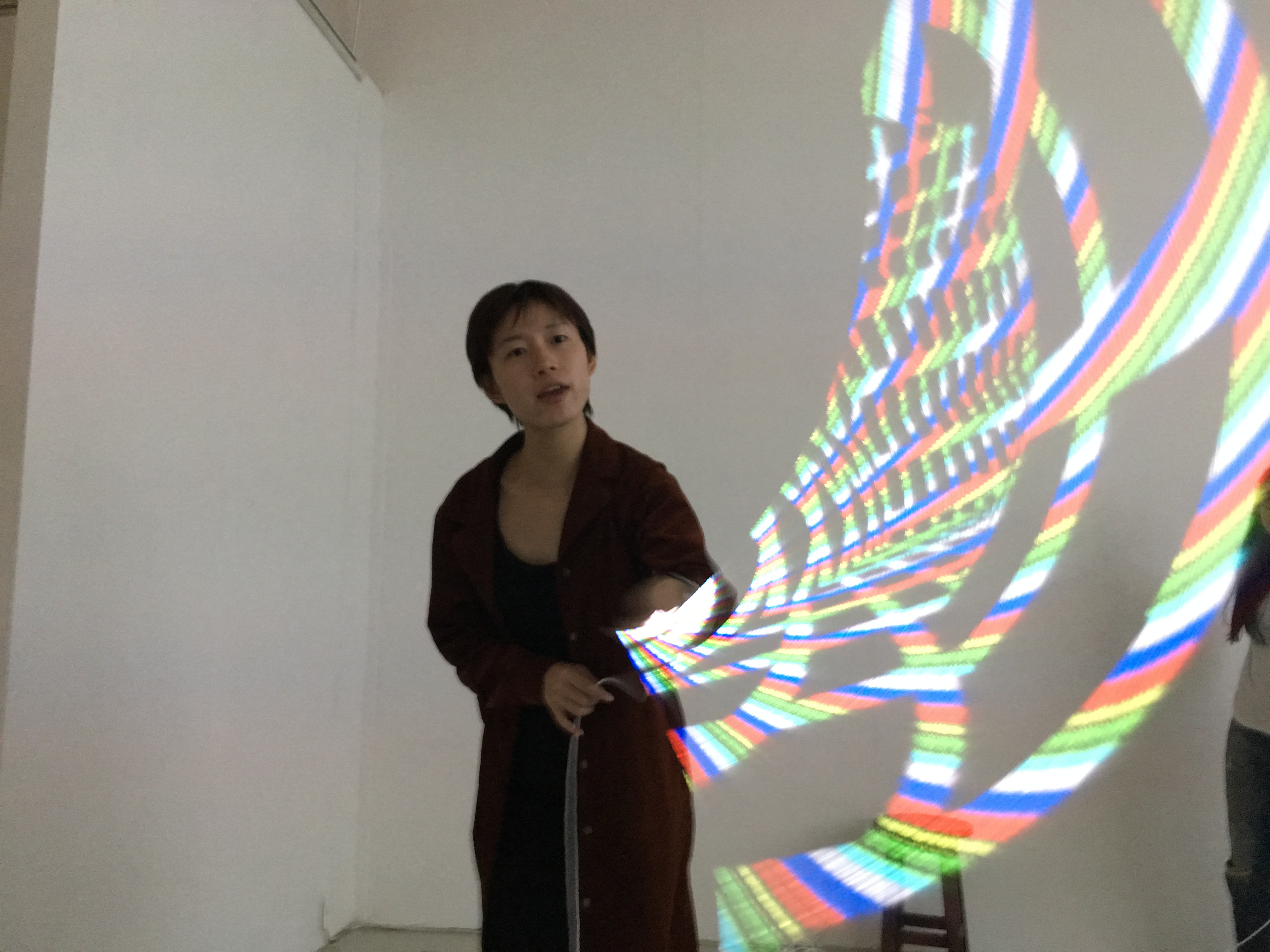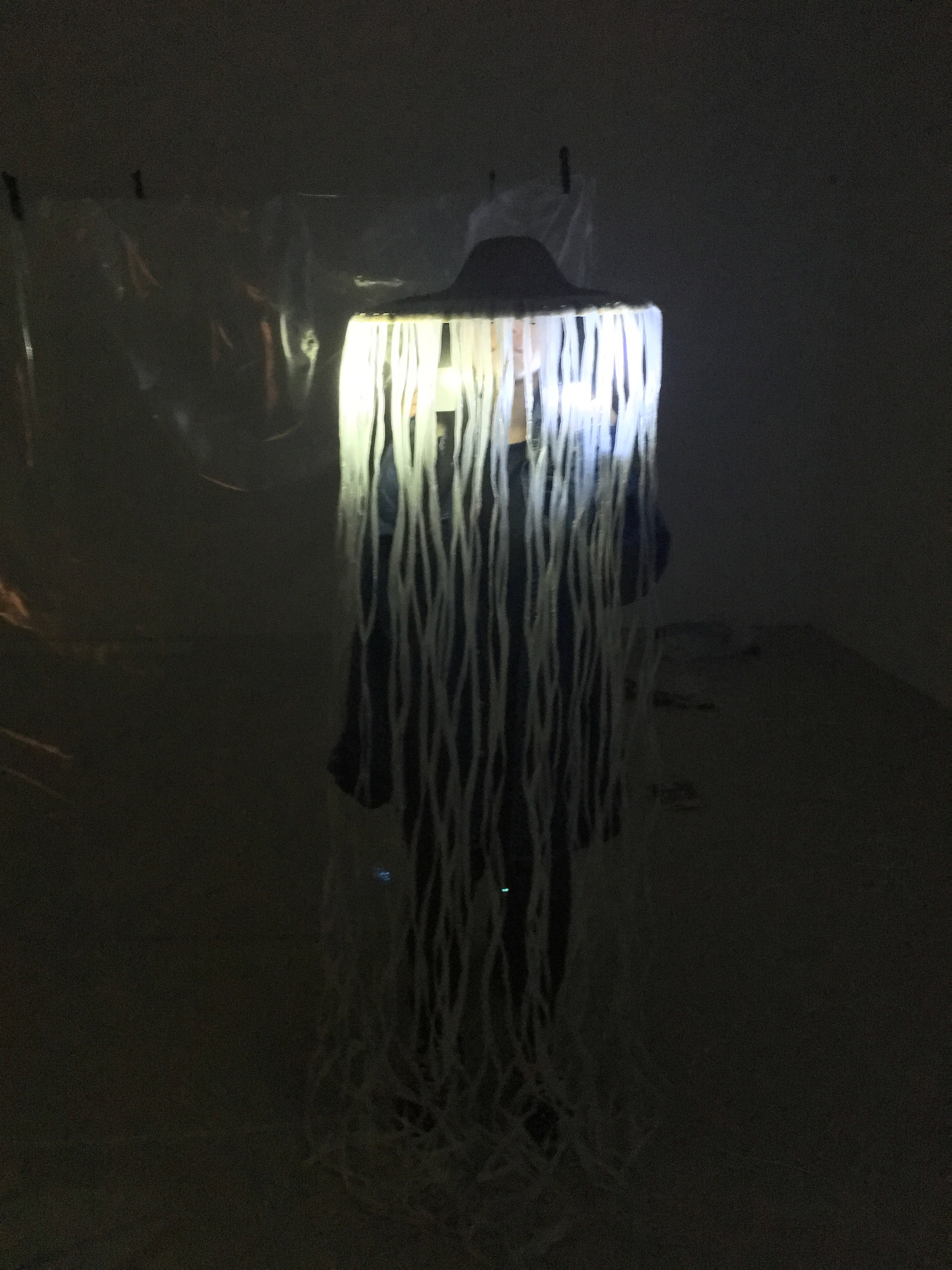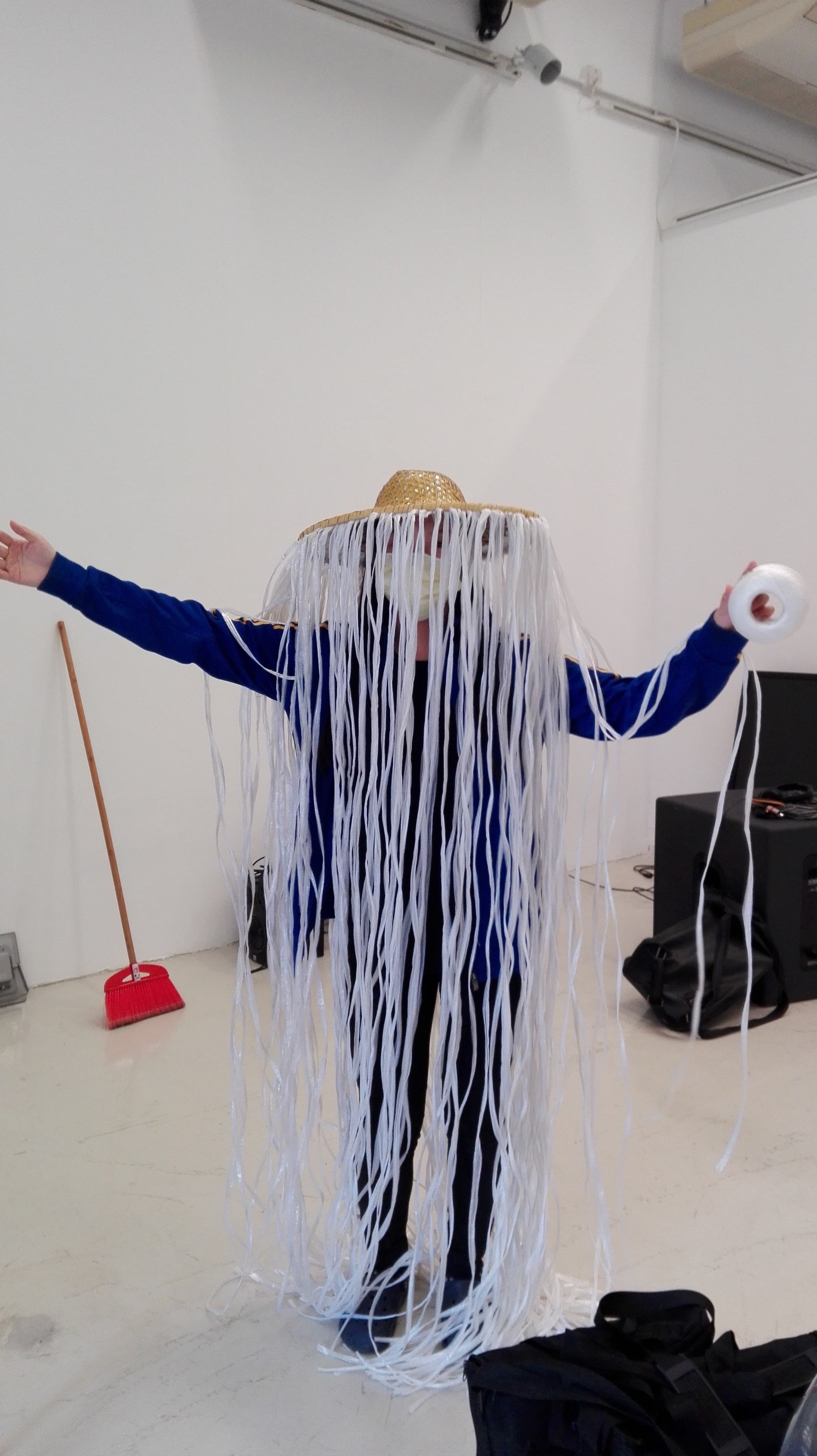 We developed costume into a certain form, which is effective to use our costume as a method of 3rd reflection. We connected white plastic strings to bamboo hat so that the strings could reflect graphics and lights from the beamer. The outfit also gives a sense of ambiguity that audience would not easily define who the performers are or what the performers represent. Plastic strings which is hung vertically address a contrast compare to the movement of performer glide horizontally on the floor.