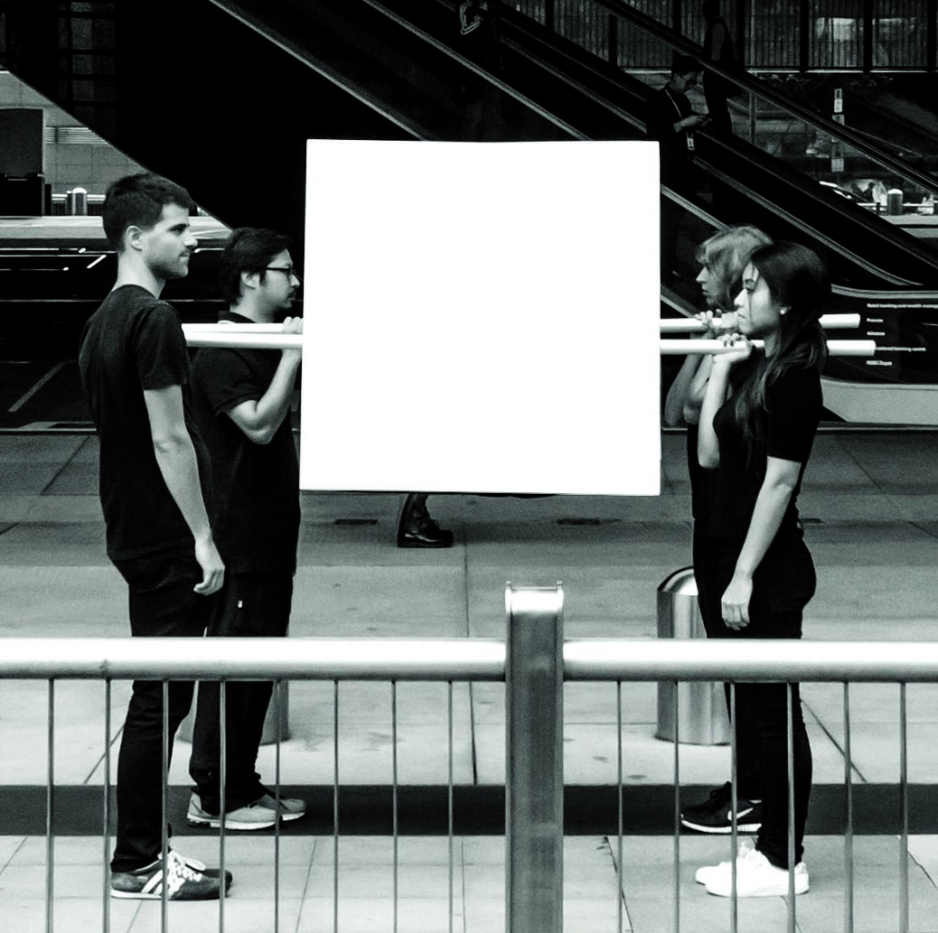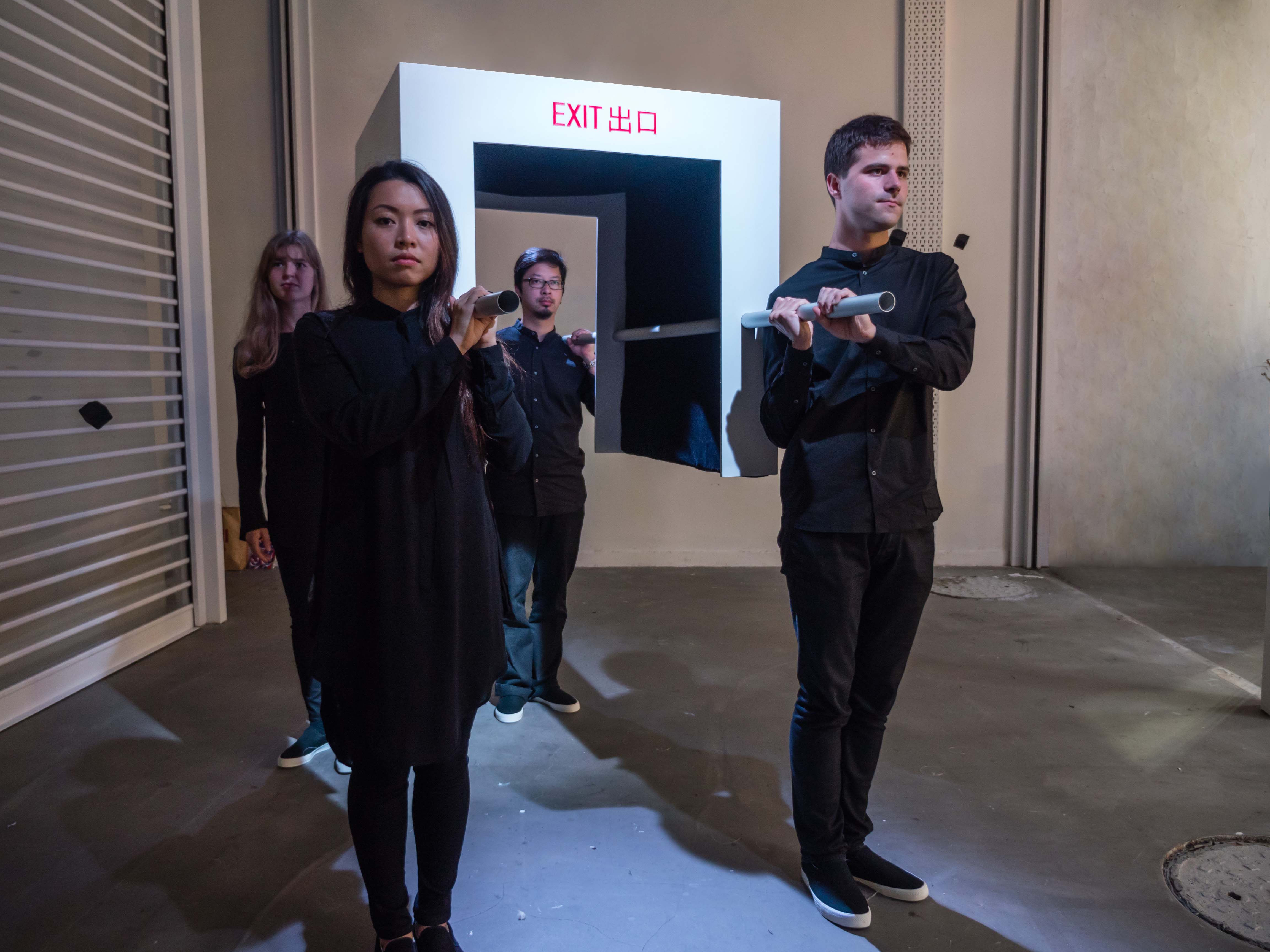 The performance at Connecting Space lasted for approximately 30 minutes and was choreographed loosely, to be able to interact with the audience. For this, we had a number of black cube-shaped speakers that were suspended in the space. For the first part of the performance, they played randomly arranged noises we recorded in Hong Kong, which created a chaotic but familiar noisescape in the room. During this time the four of us carried the white box motionlessly, while the audience could freely pass through it. After a certain period of time, people were invited to take our place and feel the weight of the silencing box. We did not give any further instructions in order to see if and when the burden is passed on to the next person. While the audience took over from us, we switched the speakers to white noise, the most pure form of noise, where all frequencies are equally represented. This created an annoying atmosphere, in which the noise-cancelling qualities of the Bubble became very evident. After finally taking back the weight from the audience and putting down the box, we switched off the speakers and exited the room towards the inside, where the performance of the Oolong-group started shortly after.