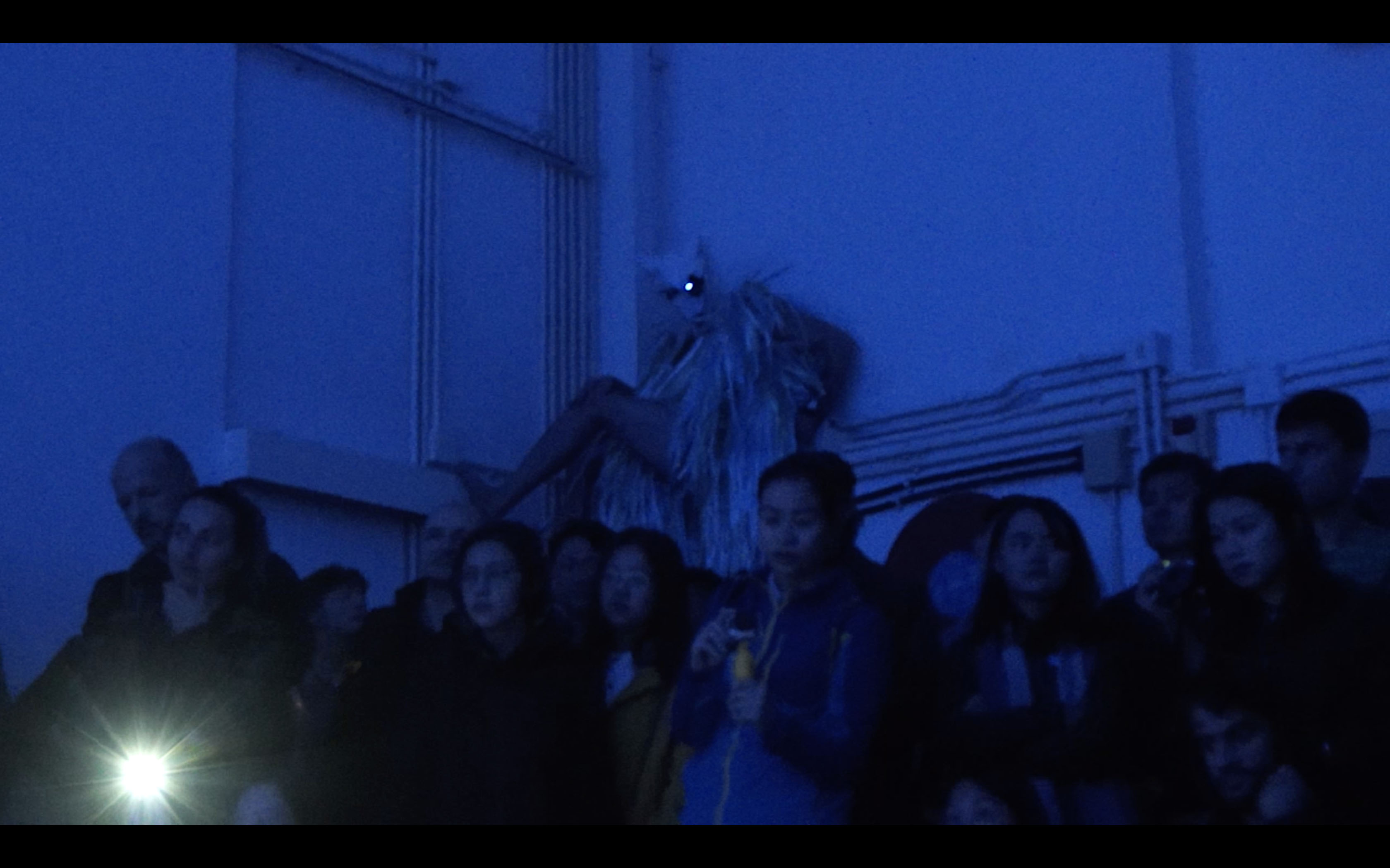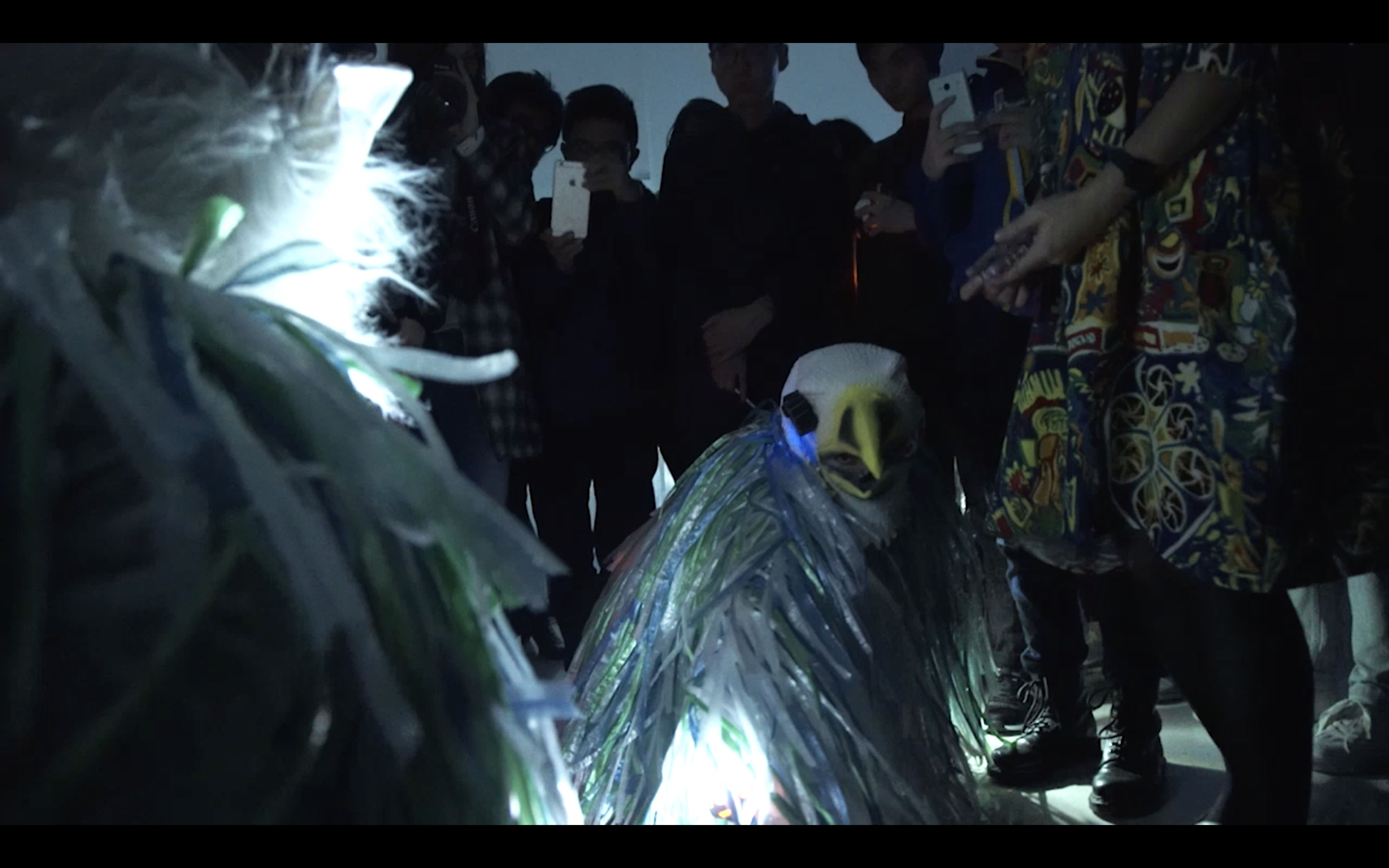 They don’t symbolise animals, nor are they human. They stand for the liminal space and time where things are not graspable anymore, they are creatures of fiction, of mutated desires. With blinking lights and audio feedbacks – produced with recorders and speakers – they move through the audience, accelerate the affective forces of movement and touching, the visual and the sonic.