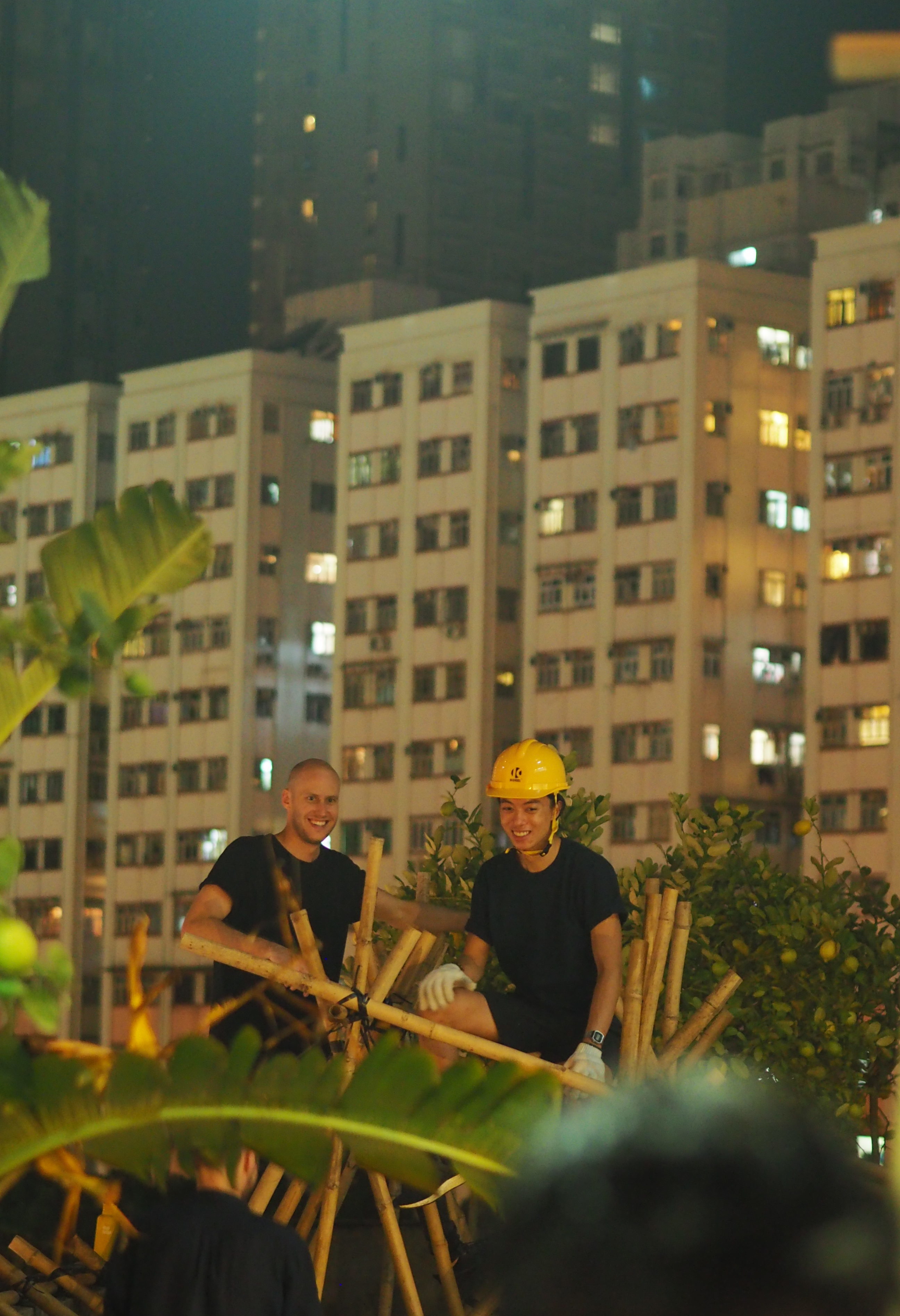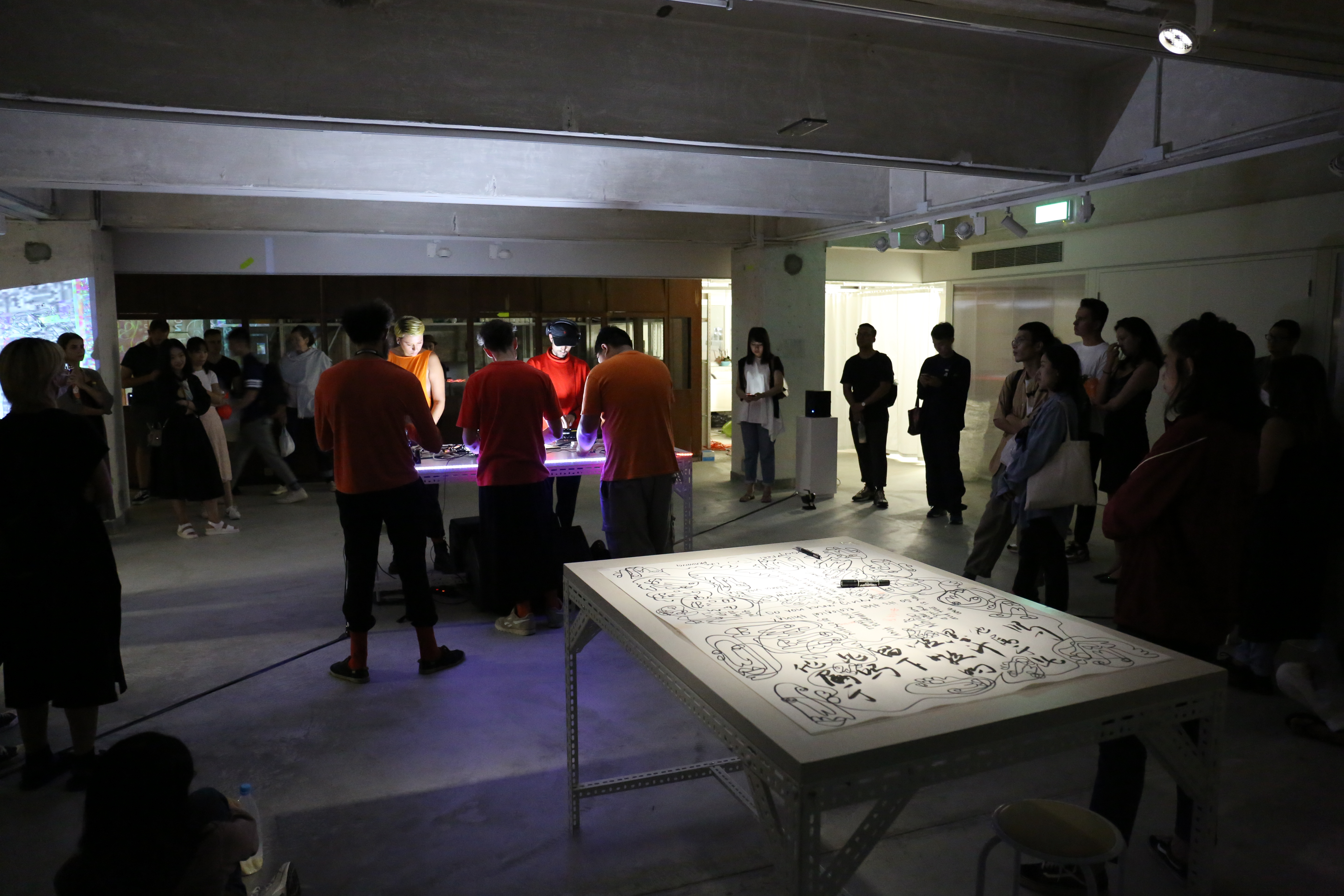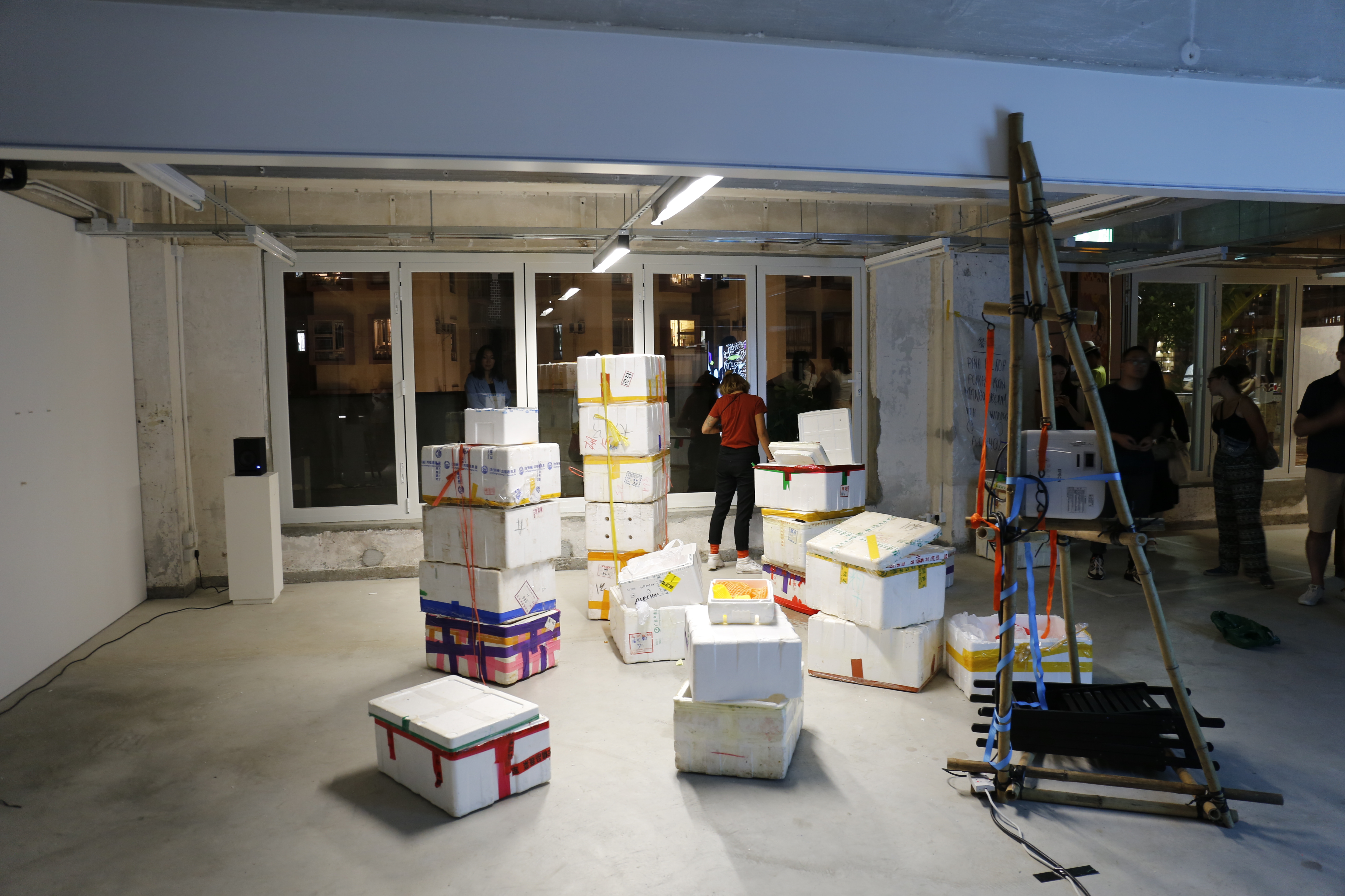 One group set up a sound island and jammed together: They layered sounds of a clarinet, a drum machine and spoken words such as poems and recordings from urban Hong Kong everyday life. Others have experimented with tape and dance performance and some built an installation to project live drawings and writings onto various surfaces in the gallery space. Another group created a corner to discuss and reflect on the ongoing political situation in the city. They invited guests on to a sofa to engage in a talk or to write their thoughts on sticky notes to post them on the wall. Outside on the terrace, a duo has brought bamboo and cable ties and tried a hand at the construction of bamboo structures. Lastly, one group dedicated themselves to supply the bar for the evening. But the bar was not just a bar – they created a Hong Kong market scene and touched the topic of plastic use and waste by handing out the drinks in used plastic bottles, which were wrapped in plastic bags or plastic sleeves. They stored the drinks in styrofoam boxes filled with ice.