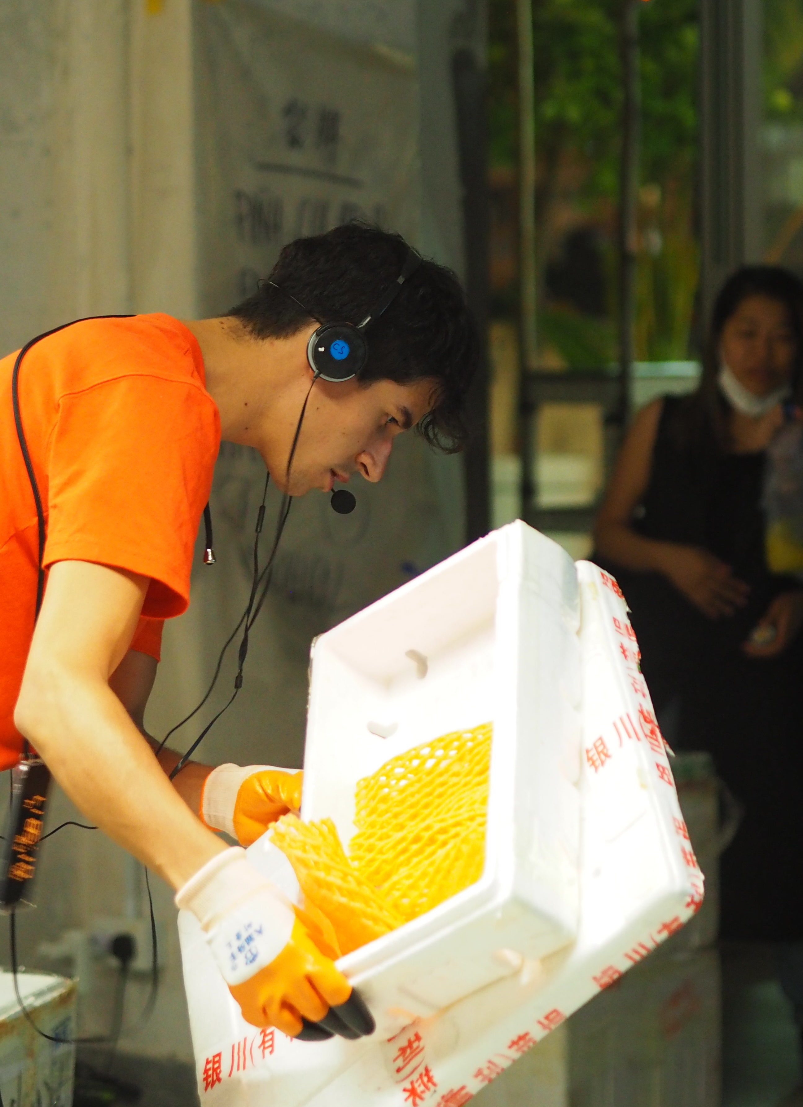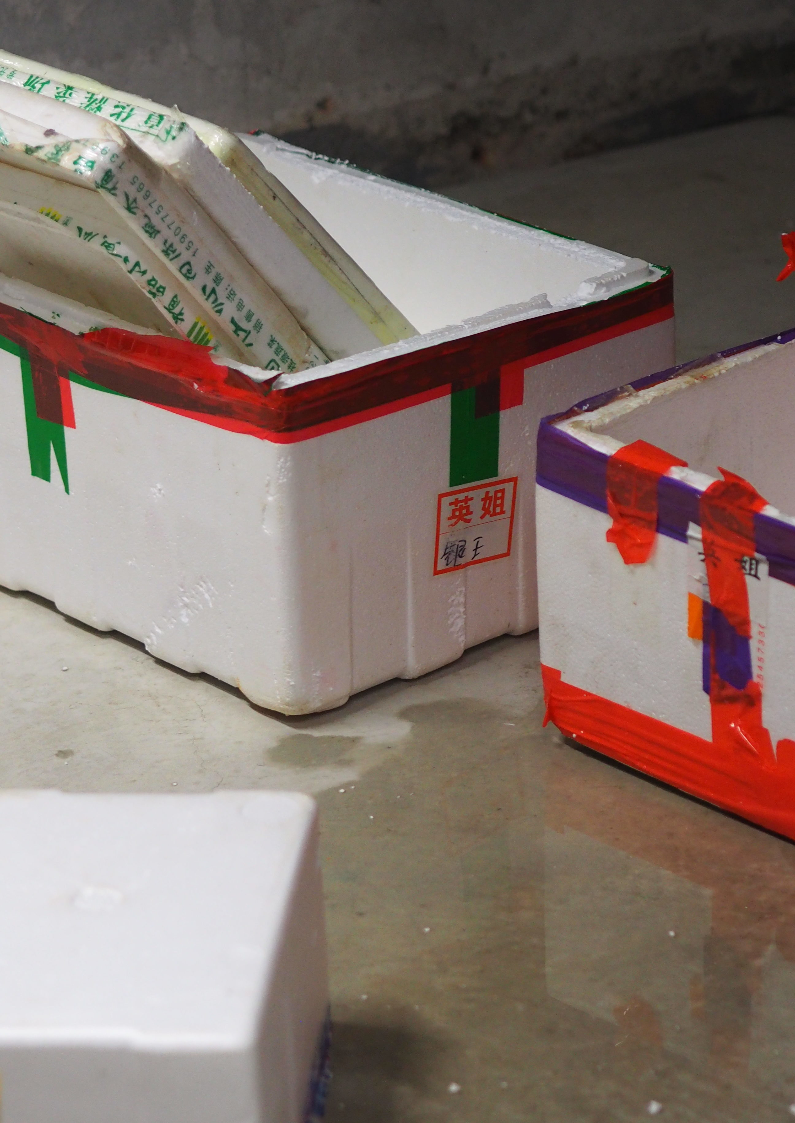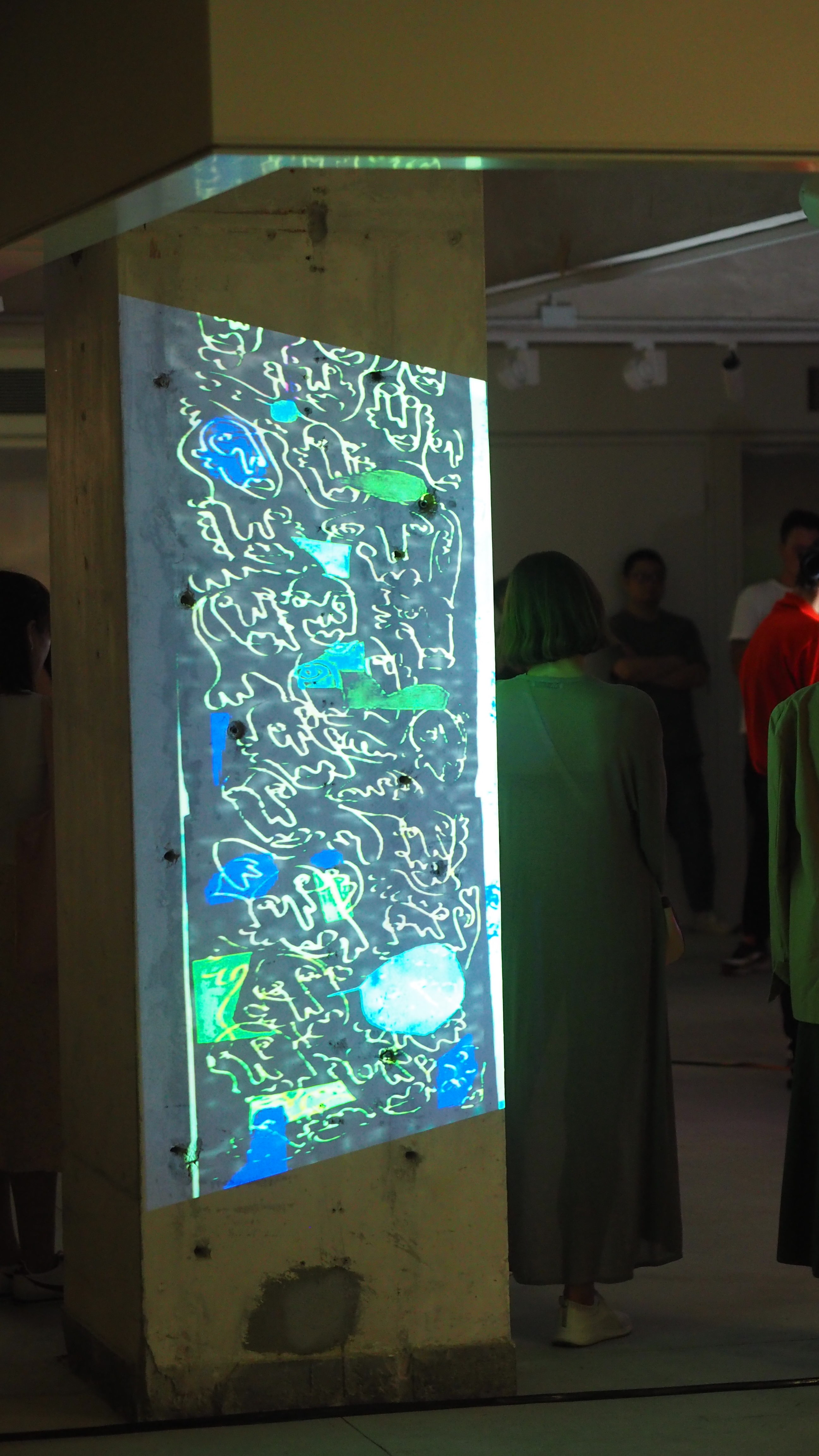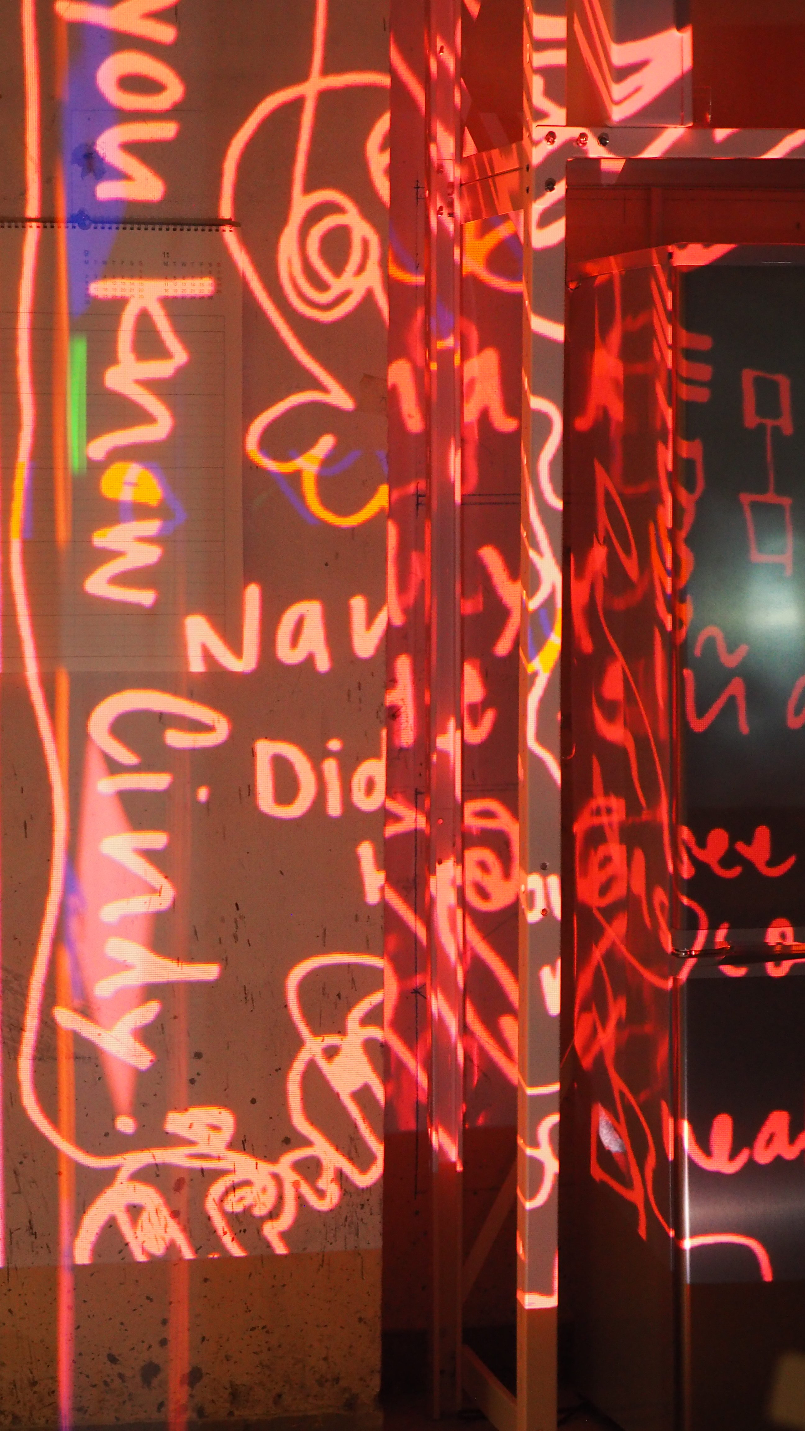One group set up a sound island and jammed together: They layered sounds of a clarinet, a drum machine and spoken words such as poems and recordings from urban Hong Kong everyday life. Others have experimented with tape and dance performance and some built an installation to project live drawings and writings onto various surfaces in the gallery space. Another group created a corner to discuss and reflect on the ongoing political situation in the city. They invited guests on to a sofa to engage in a talk or to write their thoughts on sticky notes to post them on the wall. Outside on the terrace, a duo has brought bamboo and cable ties and tried a hand at the construction of bamboo structures. Lastly, one group dedicated themselves to supply the bar for the evening. But the bar was not just a bar – they created a Hong Kong market scene and touched the topic of plastic use and waste by handing out the drinks in used plastic bottles, which were wrapped in plastic bags or plastic sleeves. They stored the drinks in styrofoam boxes filled with ice.